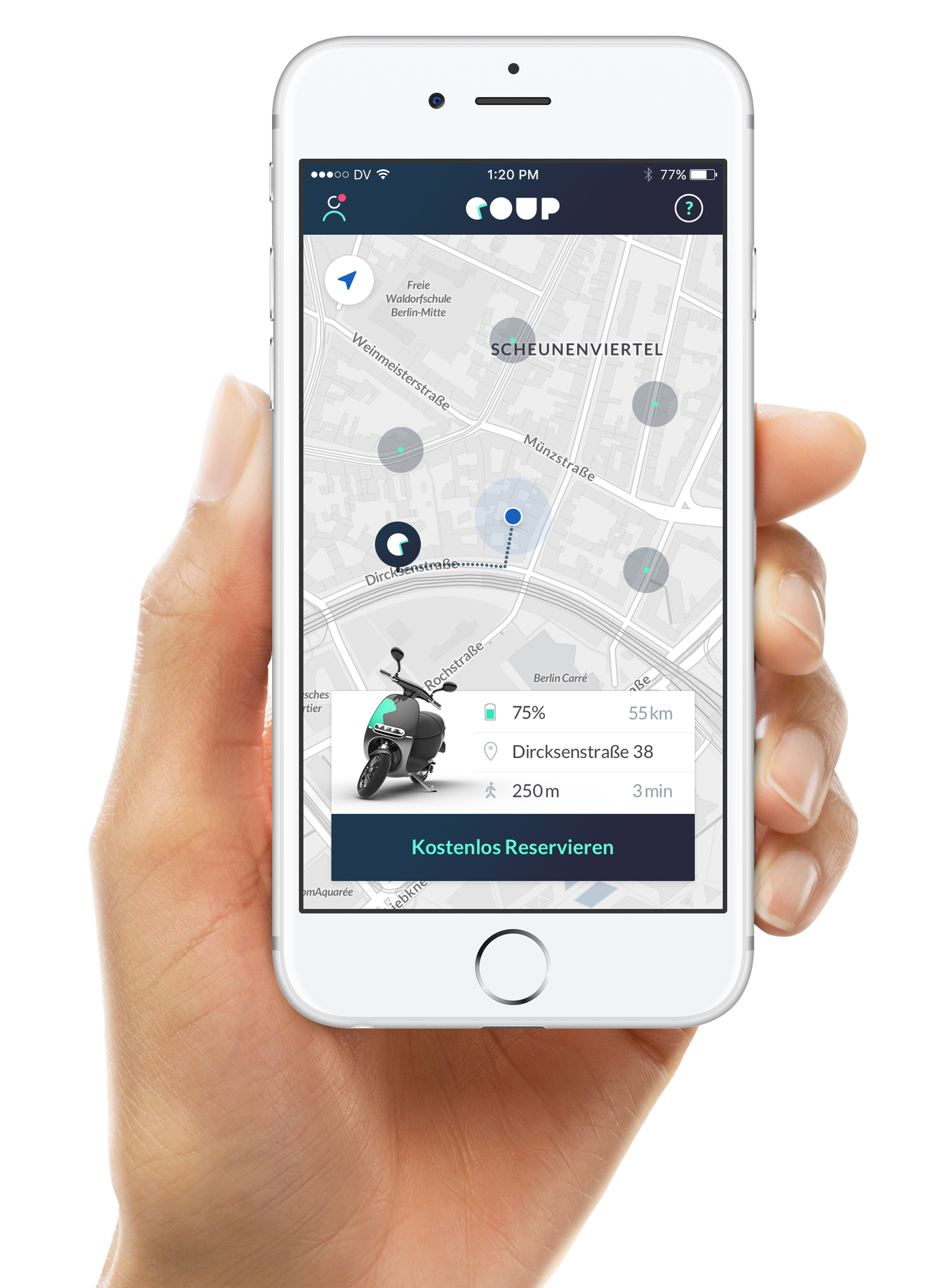 To start with, 200 connected eScooters will be available in the Berlin neighborhoods of Mitte, Prenzlauer Berg, Friedrichshain, and Kreuzberg. They have a maximum speed of 45 kph so that everyone over 21 holding a car or motorcycle driving licence can use them. The storage compartment under the seat fits one helmet and two swappable batteries. In the future, a second helmet will be provided. The eScooters have a range of around 100 kilometers. Customers will not have to worry about recharging – Coup will handle this for them. The pricing model is based on a flat-rate fee which charges 3 euros for 30 minutes or 20 euros for the whole day. The service is accessed via an accompanying app, whose intuitive interface makes it simple to find, book, and pay for a scooter. Even opening the helmet box is controlled by smartphone, which is connected to the eScooter via Bluetooth.