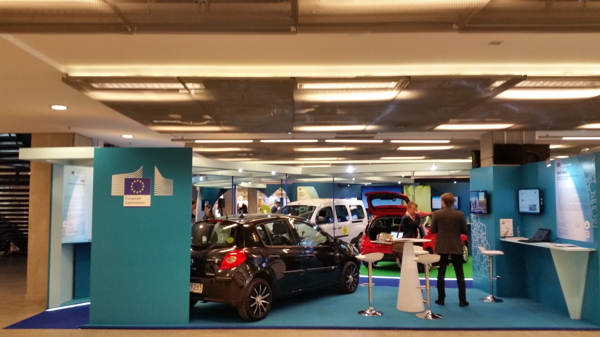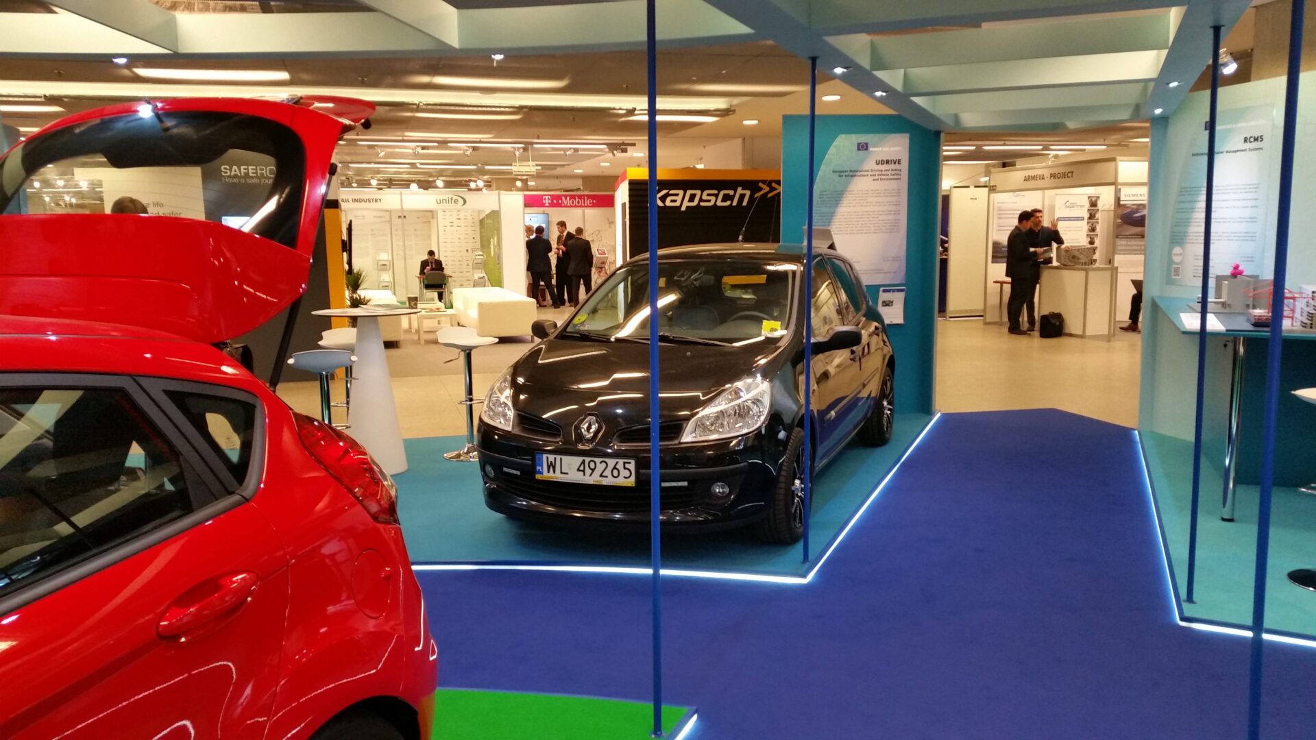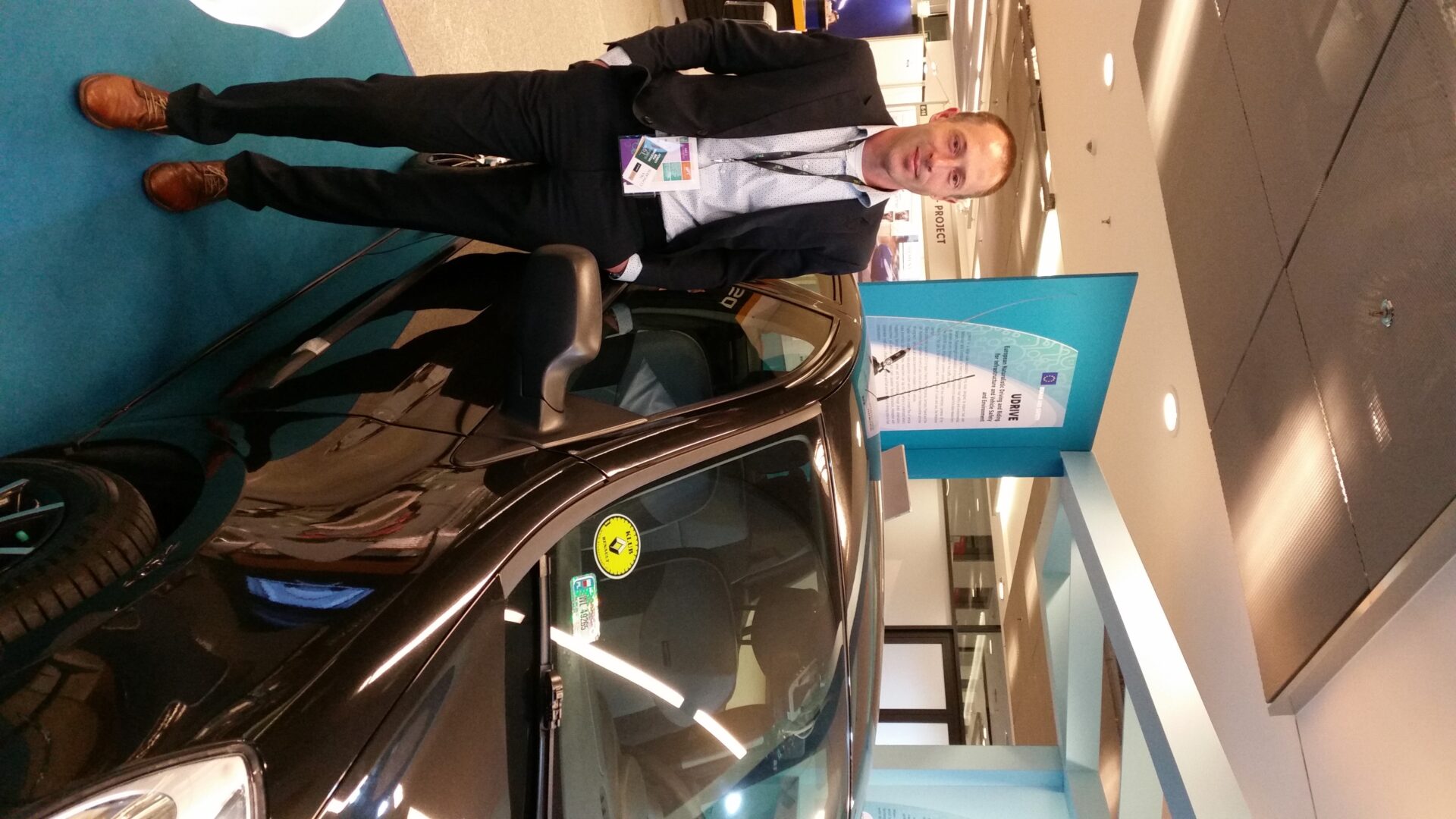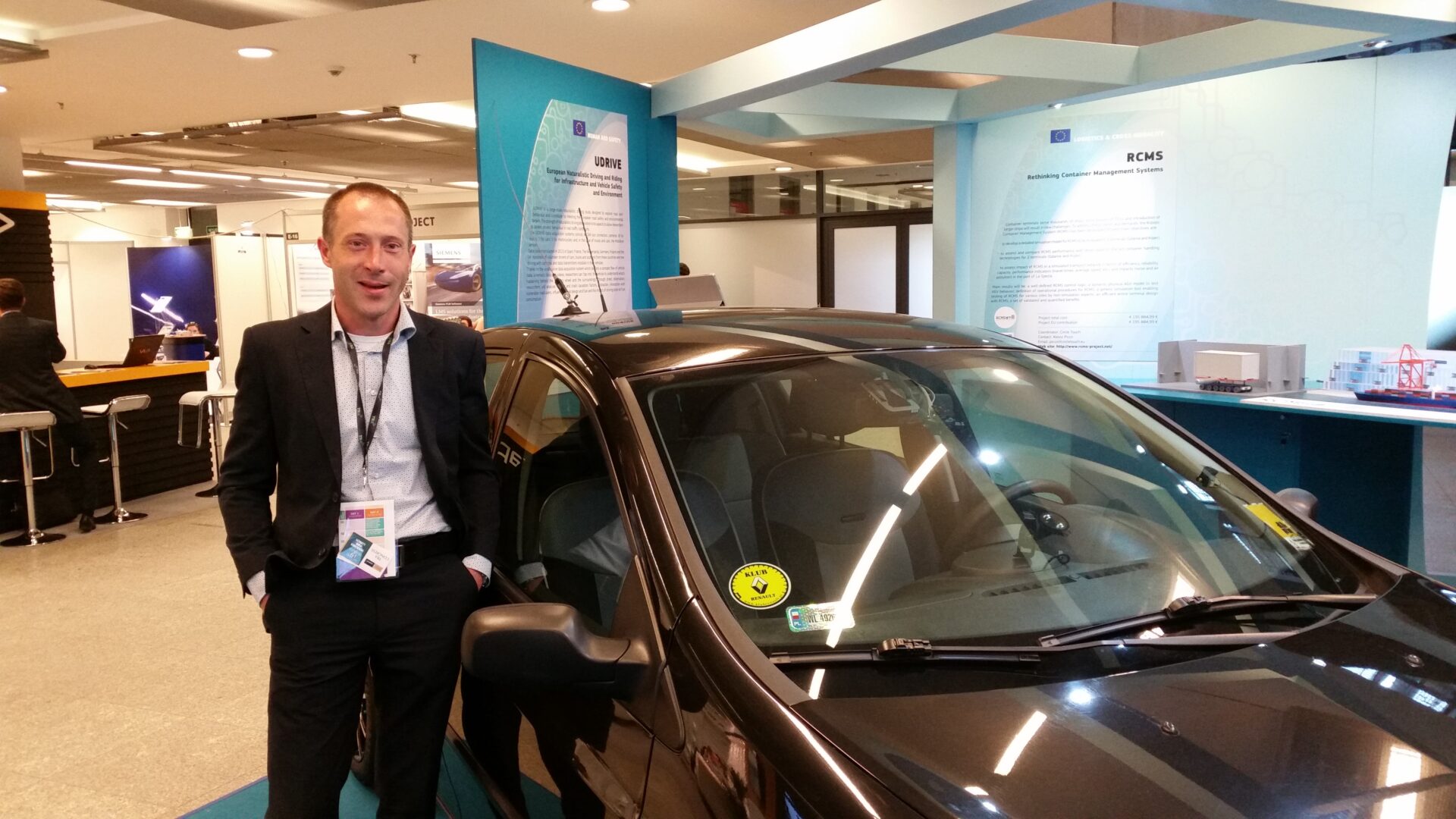 UDRIVE had a dedicated booth at the European Commission’s stand. A Renault Clio, outfitted with the UDRIVE instrumentation package was positioned within the large exhibit area. Participants could see and touch an instrumented car with the complete UDRIVE Data Acquisition System. Project partner Michiel Christoph (SWOV) showed the participants video footage with different camera views extracted from a car (see an example below). Information pannels and brochures where also available for all those who wanted further information.